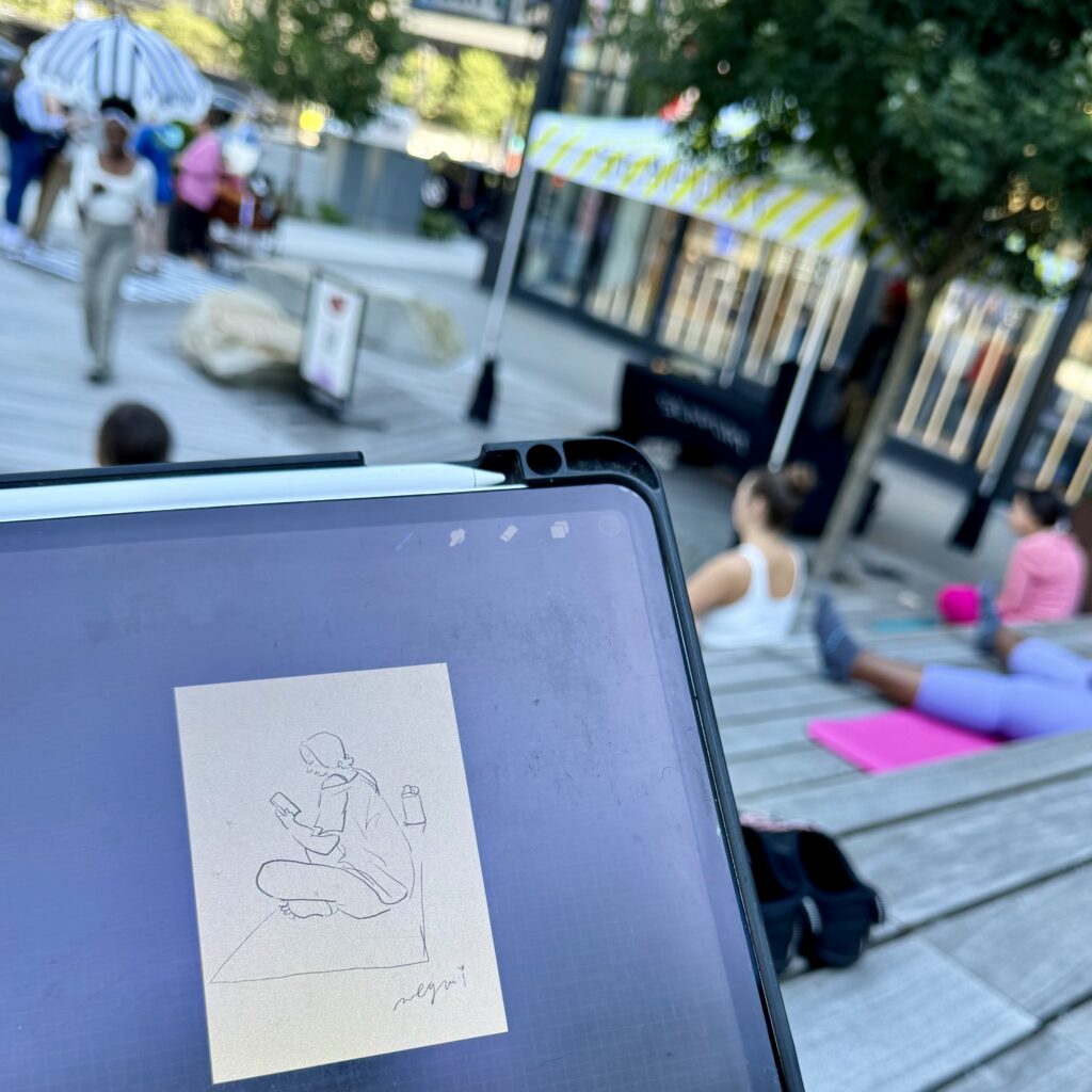 Mostly people around me, landscape sometimes. When I find the people with cute outfits, cute couples or friends having fun time together, I want to sketch them to keep the happy moments on my sketch books.