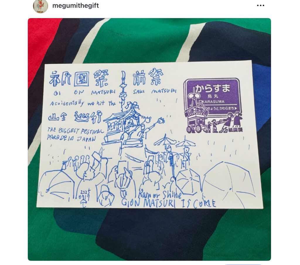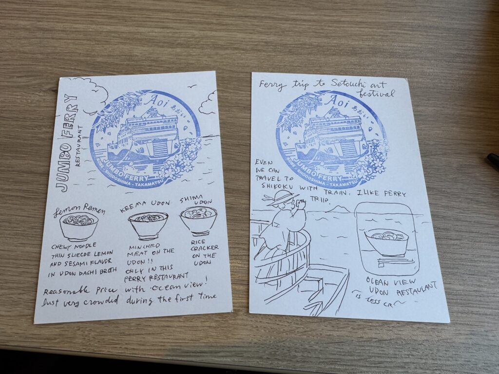 So, I stamp on the side of the postcard, and sketch on the site, write the comment . That become the souvenir postcard to myself.