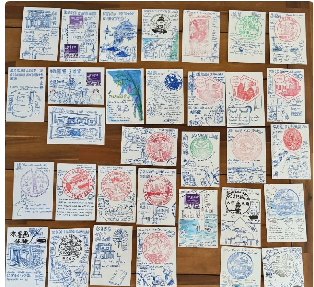 If you go to travel to Japan. Buy the postcards or sketch book at the 100yen shop and hunt the stamps from anywhere Japan.
